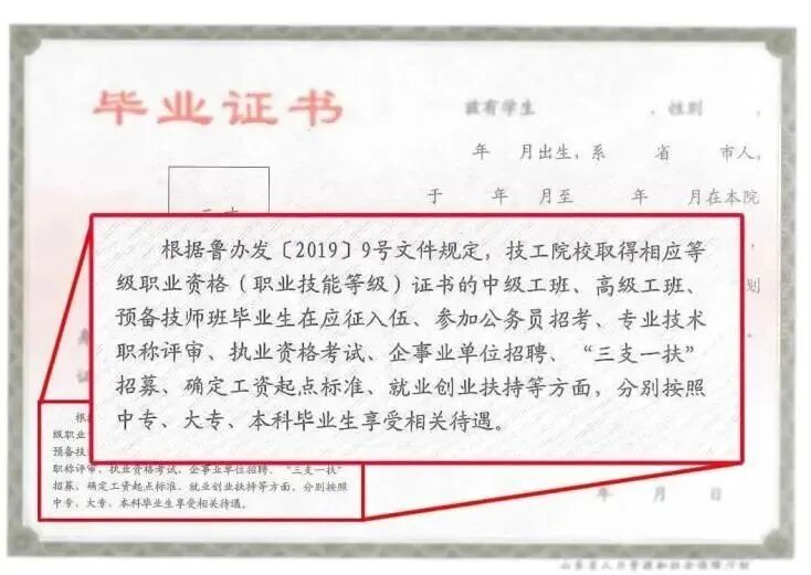 2.中共山东省委办公厅、山东省人民政府办公厅《关于进一步提高全省技术工人待遇的通知》(鲁办发〔2019〕9号)规定,技工院校取得高级工、预备技师职业资格(职业技能等级)的全日制毕业生,在应征入伍、参加公务员招考、专业技术职称评审、职业资格考试、企事业单位招聘、“三支一扶”招募、确定工资起点标准、就业创业扶持等方面,分别按照大专、本科毕业生享受相关待遇。