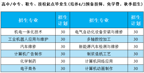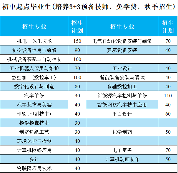 注:1.初中生毕业生报考预备技师,采取3+3培养模式,学生完成中级技工阶段学习,直修预备技师。