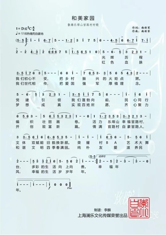 近日,潍城区乐埠山生态经济发展服务中心官路村的村歌《和美家园》正式创作完成,悠扬旋律搭配质朴歌词,不仅唱出了官路村的红色底蕴与文明新风,更凝聚起全村人奋进新时代、建设和美家园的磅礴力量。